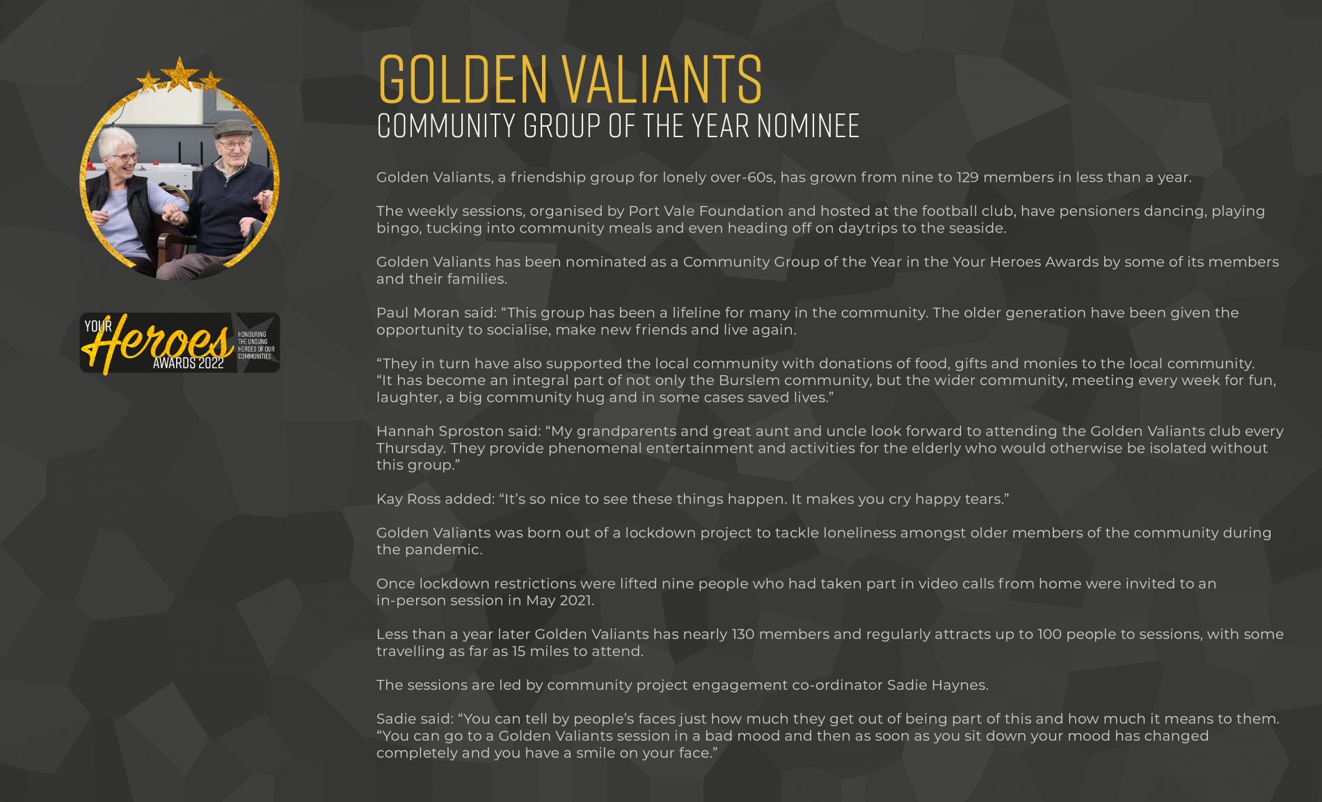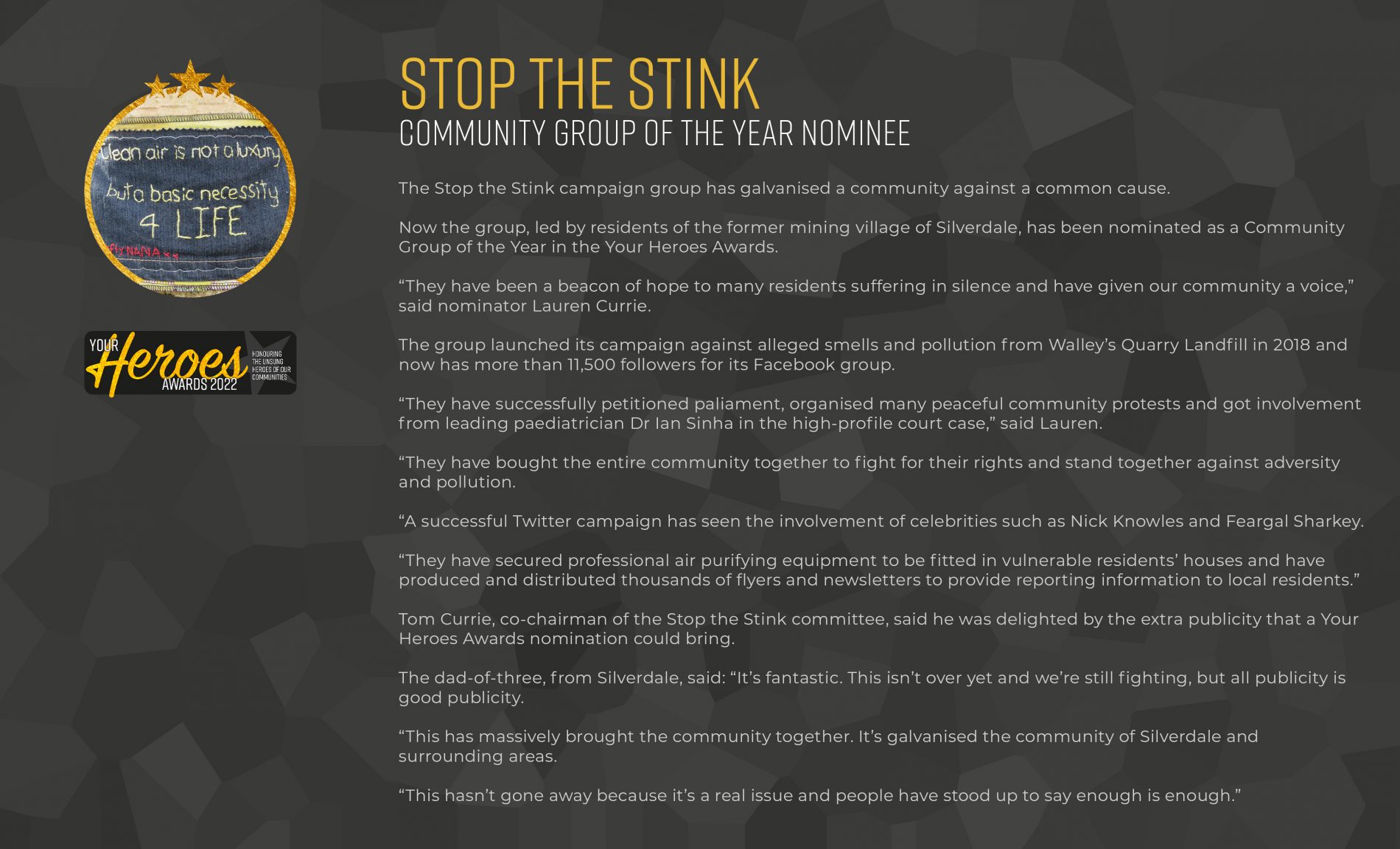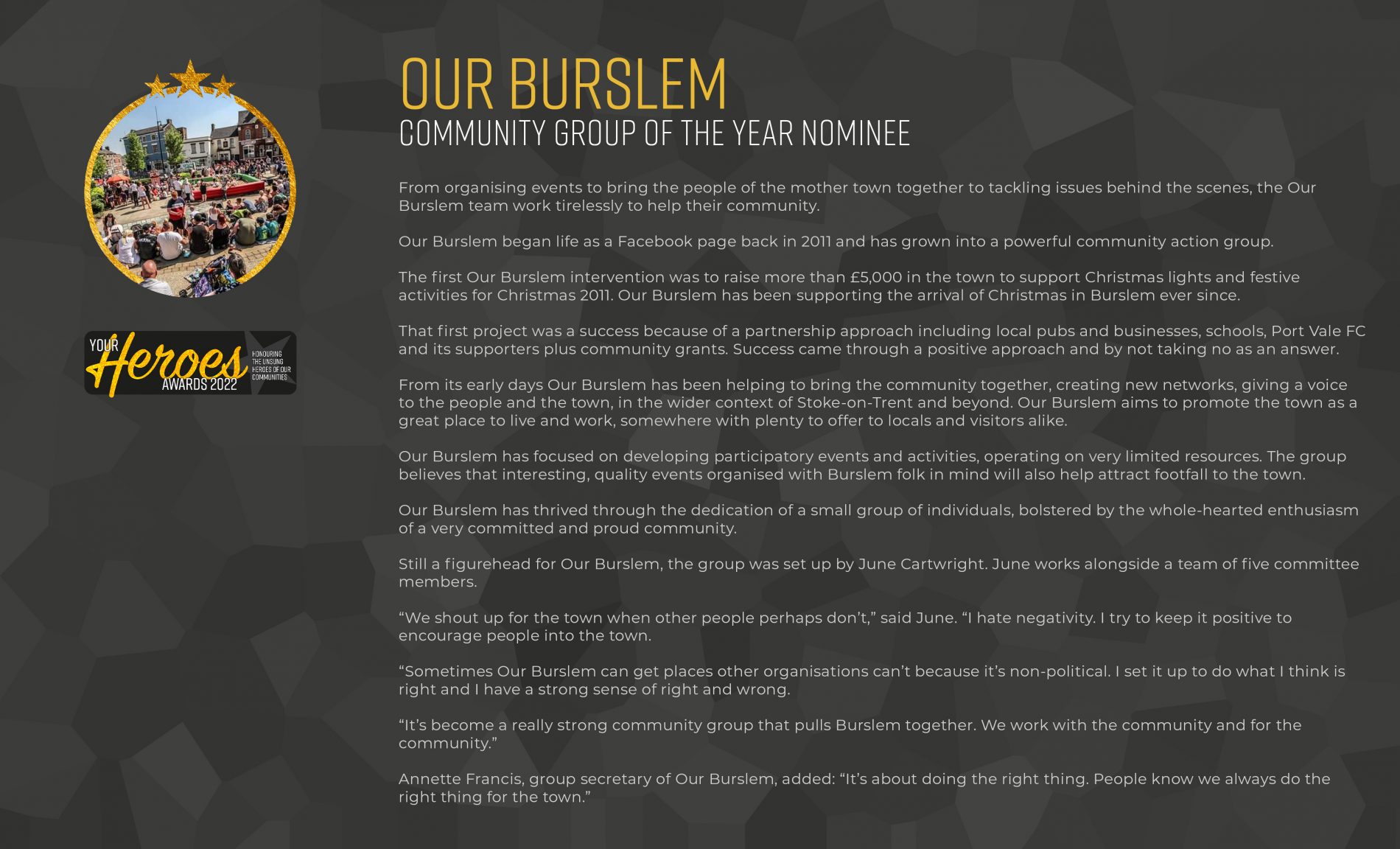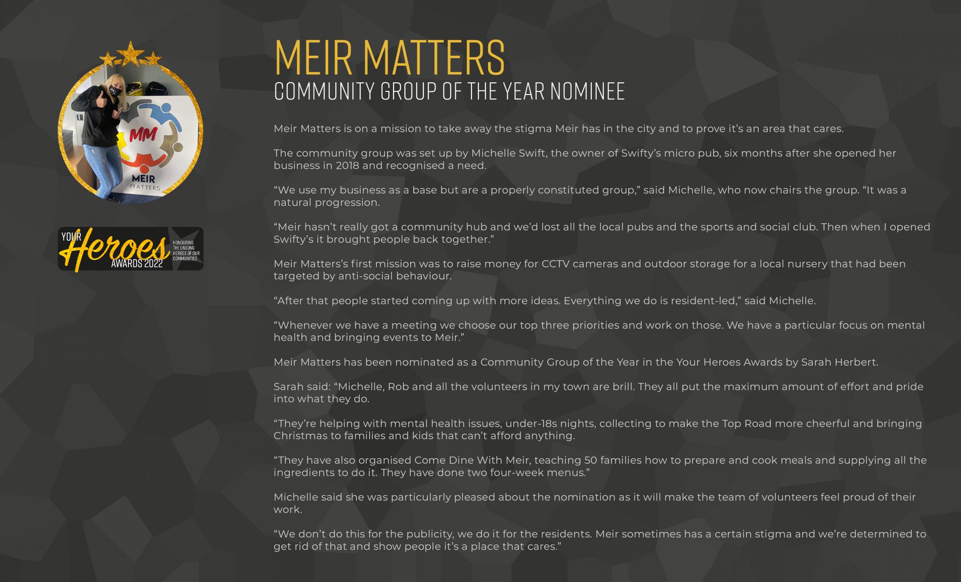 She has been nominated as a Charity Champion or Volunteer of the Year in the Your Heroes Awards and Meir Watch has been nominated as a Community Group of the Year.