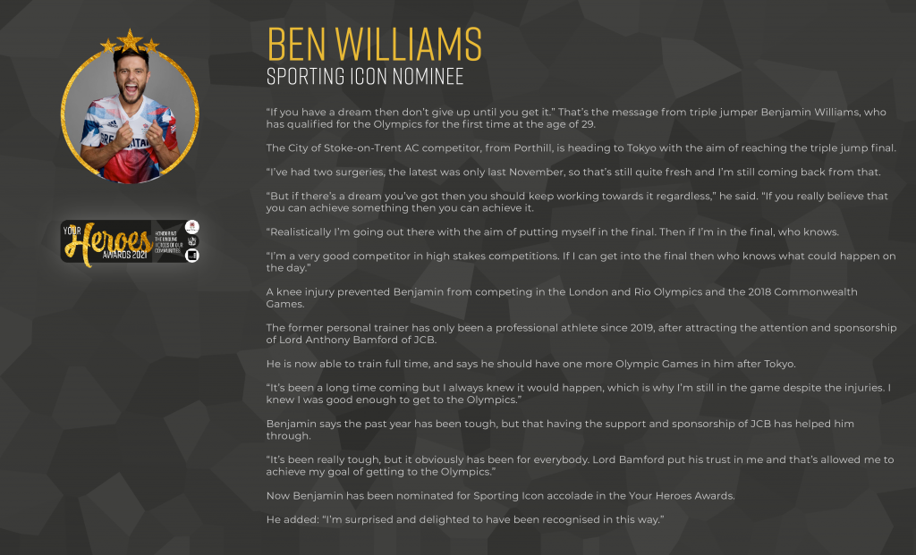 He’s been nominated as a Sporting Icon in the Your Heroes Awards by Gareth Thomas, Commercial and Partnerships Lead at Staffordshire FA.