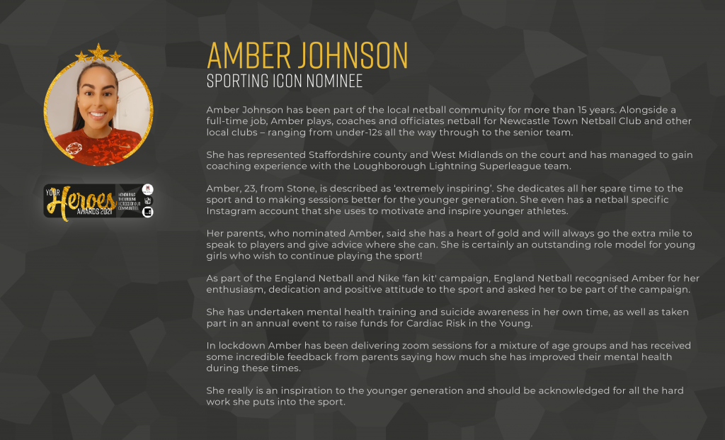 She has been nominated as a Sporting Icon in the Your Heroes Awards by Martyn Irvine, Assistant Head Coach of the Stoke City Women’s Team.